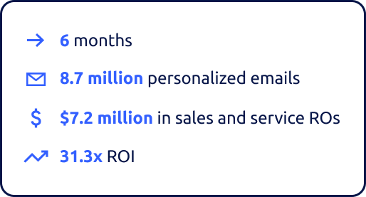 From July through the end of December 2025, leveraging Fullpath’s Audience Activation, Garber Automotive Group sent out a whopping 8.7 million hyper-personalized emails, something that would have been impossible to achieve without AI automation. In that same time frame, the dealership group closed $7.2 million in sales and service ROs directly attributed to email performance. That’s a 31.3x ROI on their investment on email alone.