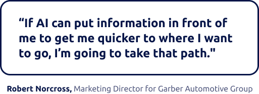 While there is still some mistrust in the automotive industry when it comes to the implementation of AI and automations for fear that they will take jobs away from people, the team at Garber Automotive sees it differently. The shift to Fullpath was a strategic move that allowed the team to focus on the things AI and automation can’t do. Robert views AI and automation not as a threat, but as a necessary evolution for a modern marketing director.