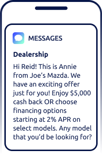 Yes. Fullpath’s SMS campaigns are highly targeted, timely, and personalized for each individual shopper based on their latest needs and preferences, increasing the likelihood of re-engaging cold leads and bringing them back into your dealership for their next purchase.
